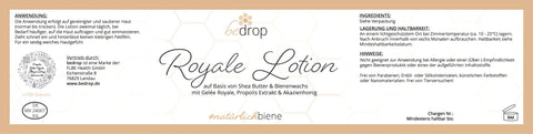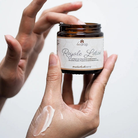 Die Royale Lotion kombiniert die Kraft hochwertiger Bienenprodukte wie Gelée Royale, Akazienhonig und Propolis mit der pflegenden Wirkung von Sheabutter und Bienenwachs. Diese besondere Zusammensetzung spendet intensive Feuchtigkeit, fördert die Hautregenerierung und sorgt für ein straffes, strahlendes Hautbild. Dank ihrer geschmeidigen Textur zieht die Lotion schnell ein und verwöhnt die Sinne mit einem angenehmen, dezenten Duft.