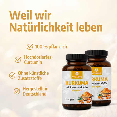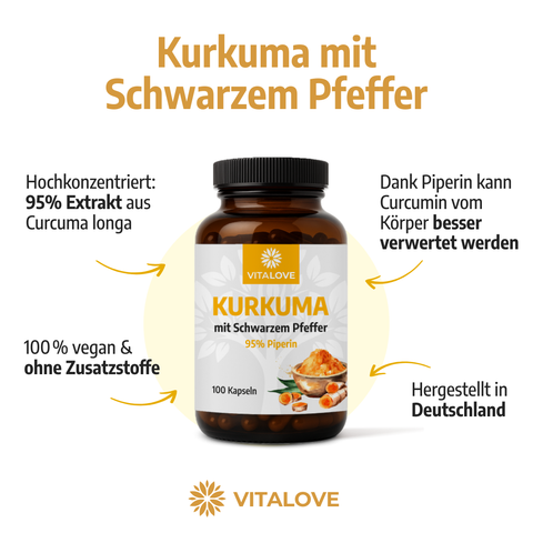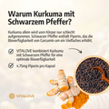 Curcumin allein wird nur schlecht vom Körper aufgenommen. Durch die Zugabe von Piperin aus Schwarzem Pfeffer wird die Bioverfügbarkeit deutlich gesteigert, sodass der Körper die wertvollen Inhaltsstoffe besser verwerten kann.