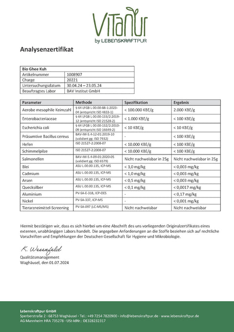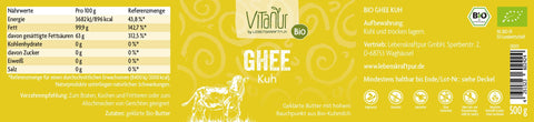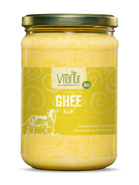 Verwenden Sie Bio Ghee Kuh als gesunde Alternative zu herkömmlicher Butter oder Öl. Ideal für das Kochen bei hohen Temperaturen, da es einen hohen Rauchpunkt hat.