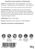 Die Mischung besteht aus einer sorgfältigen Auswahl an Kräutern, die traditionell zur Unterstützung des weiblichen Zyklus eingesetzt werden. Die genaue Zusammensetzung ist auf der Verpackung angegeben.