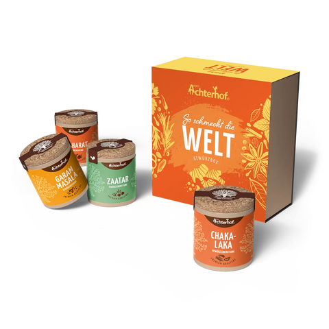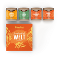Das Geschenkset beinhaltet vier hochwertige Gewürz- oder Kräutermischungen, verpackt in praktischen und umweltfreundlichen Pappdosen mit stilvollem Korkdeckel. Die nachhaltige Verpackung kombiniert Funktionalität mit Design und kommt in einer charmanten Geschenkbox direkt zu Ihnen nach Hause – perfekt für Küchenliebhaber und alle, die gerne neue Aromen entdecken.